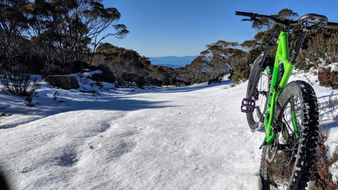 By mountain biking standards, the fire trail which traverses the north-eastern face of Kunanyi is not exciting. Maybe a little more so when covered in snow, but it is wide and only occasionally steep.
